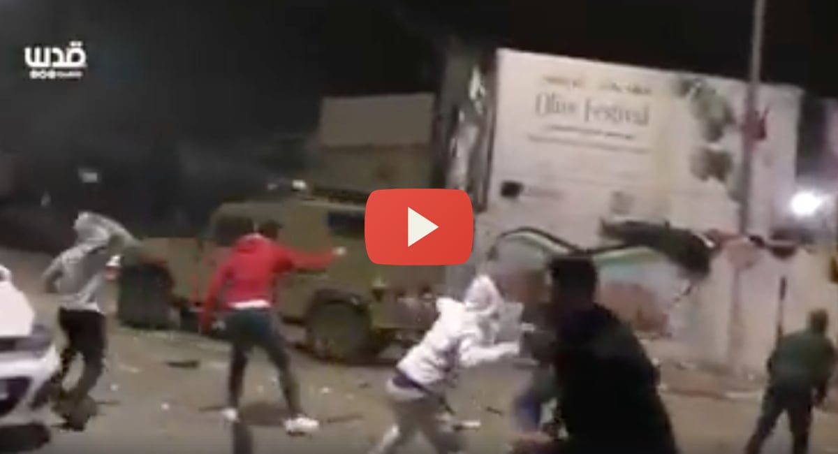 Flocks of Arabs attack army vehicles as the IDF tries to catch a vicious terrorist. He murdered a 19 year old girl in a way that is too difficult to hear.