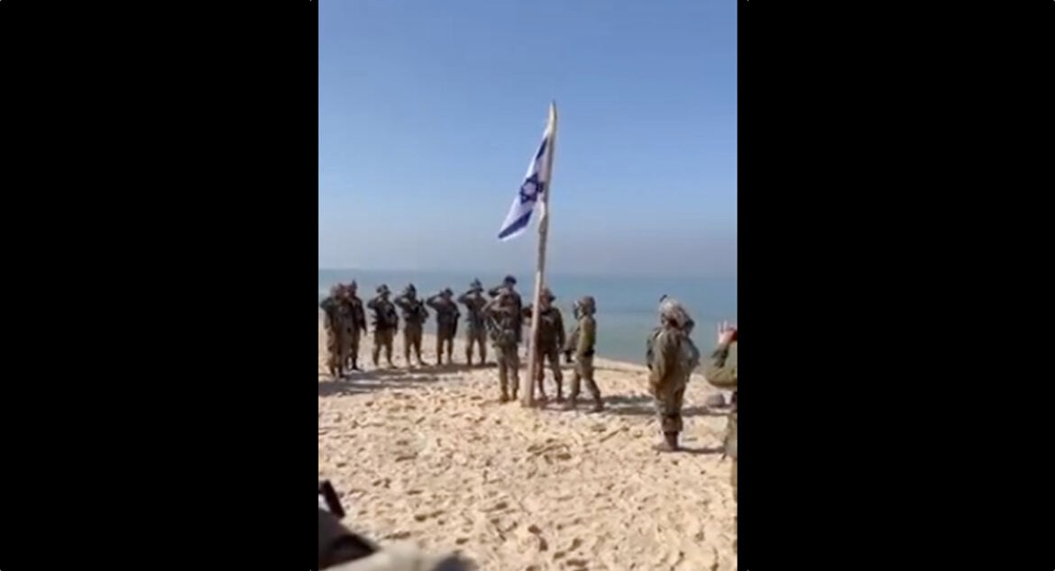 A soldier recording his comrades raising the flag can be heard in the video saying that three weeks after the Oct. 7 massacre of Israelis by Hamas terrorists, troops “lift the flag of Israel in the heart of Gaza, along the beach. We will not forget, we will not forgive and we will not stop until victory.”