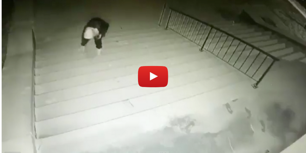 Surveillance video shows that around midnight a male spray painting the door and steps of South Street Temple and then stepping back and taking a photo of his offensive work.