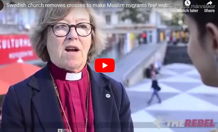 Ezra Levant, Canadian attorney, media personality, political activist, writer and broadcaster, has a point. It’s difficult to remain a Church, a place of worship for the Christian religion, if you take out all religious symbols from the building and expect worshipers of another religion to join your congregation. What makes Bishop Eva Brunne’s efforts particularly peculiar is the fact that she herself is a lesbian. That would be penalized by death by Muslim law. Taking the crosses out of the Church and arranging the chairs to face Mecca is not going to change Muslim religious law. And Bishop Brunne may find herself having to pay a high price for creating a Muslim-friendly church.