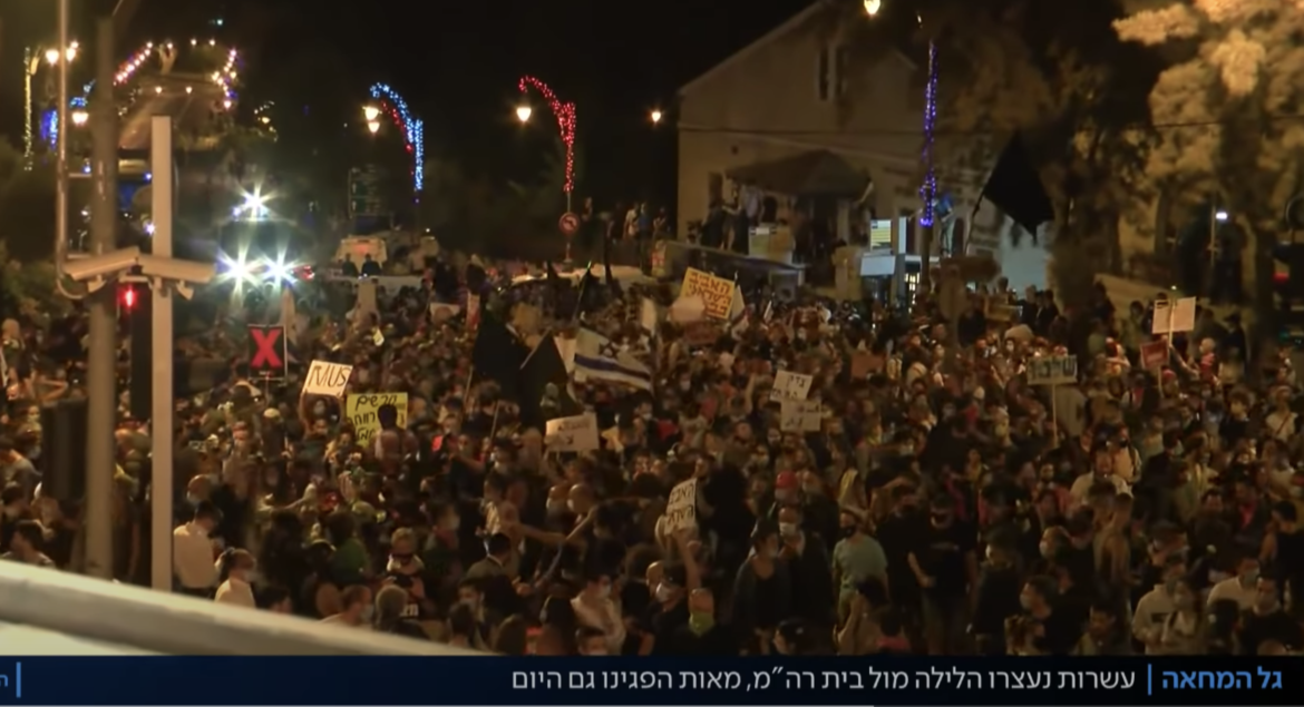 Bottom frame: Reporting on the thousands of anti-Netanyahu protesters that were out protesting at hundreds of locations across Israel last night. Note, no, they did not talk about how some of the protests, like the 15 km March in Tel Aviv, were also going against the corona regulations.